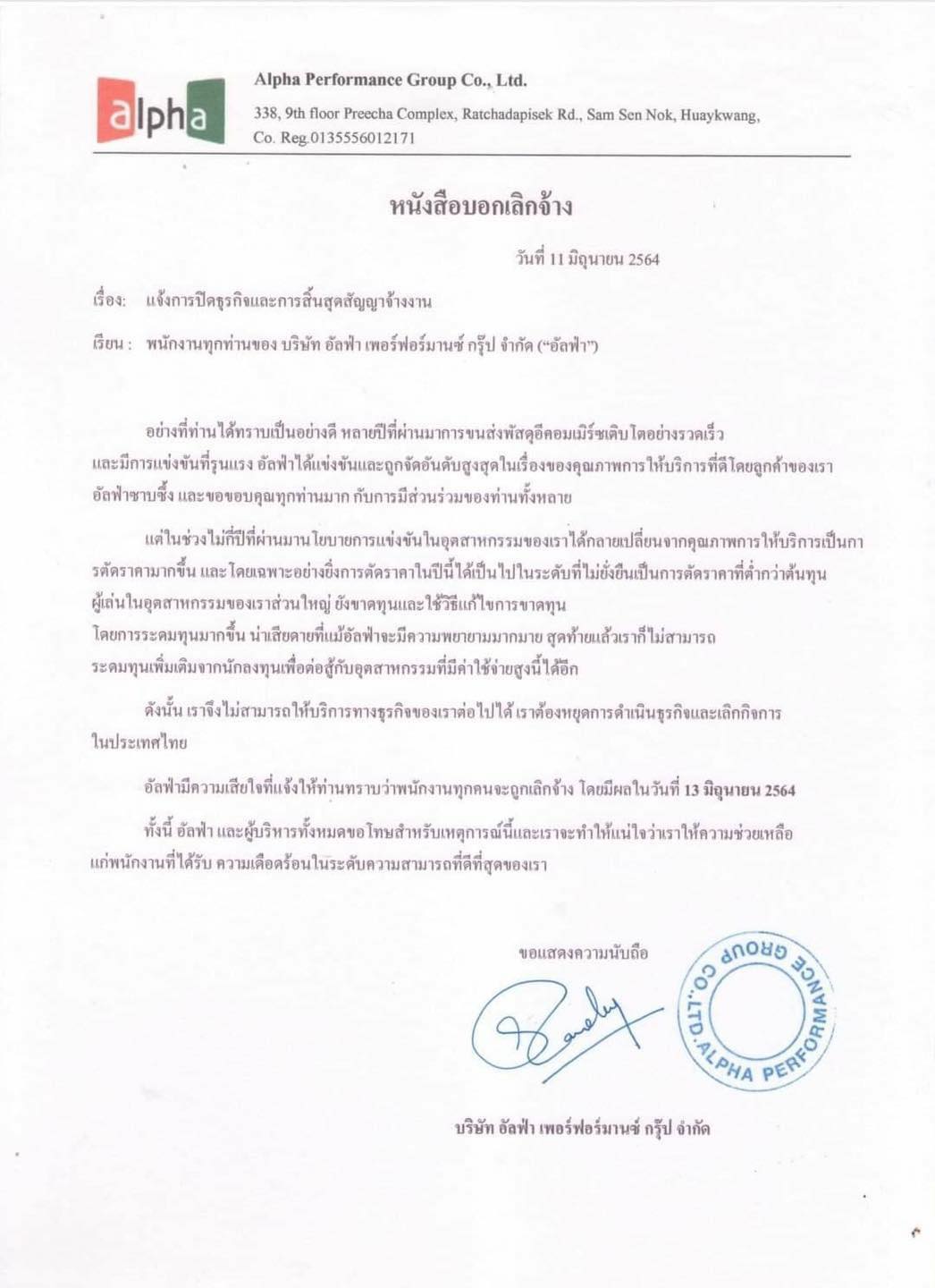 ดังนั้น เราจึงไม่สามารถให้บริการทางธุรกิจของเราต่อไปได้ เราต้องหยุดการดำเนินธุรกิจและเลิกกิจการในประเทศไทย โดยอัลฟ่ามีความเสียใจที่แจ้งให้ท่านทราบว่าพนักงานทุกคนจะถูกเลิกจ้าง โดยมีผลในวันที่ 13 มิถุนายน 2564 ทั้งนี้ อัลฟ่าและผู้บริหารทั้งหมดขอโทษสำหรับเหตุการณ์นี้ และเราจะทำให้แน่ใจว่า เราได้ให้ความช่วยเหลือแก่พนักงานที่ได้รับความเดือดร้อนในระดับความสามารถที่ดีที่สุดของบริษัท