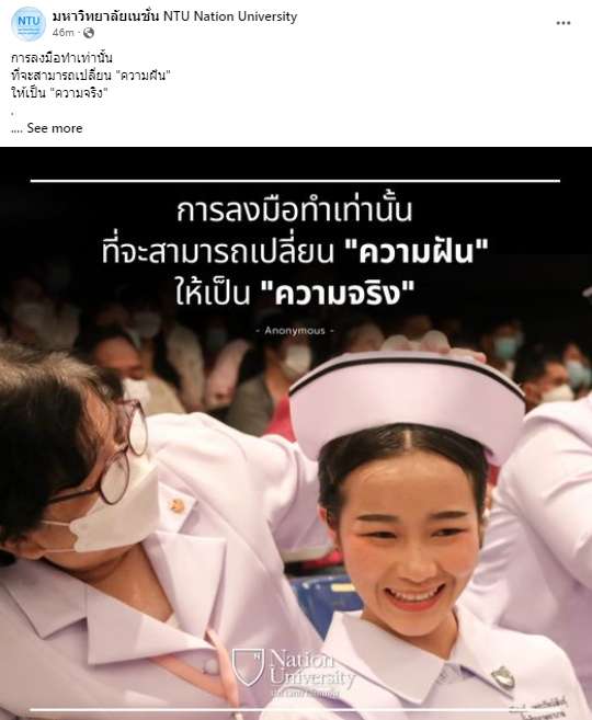 ฝันที่เป็นจริง ที่ได้จากการลงมือทำ ปัจจุบัน มีสื่อสังคม องค์กร ผู้คน หรือ influencer ให้เราได้ติดตามได้ง่ายกว่าในอดีต เหตุผลที่เราติดตามใคร หรือองค์กรใดก็อาจเกิดจากความสนใจ ความชอบ ความประทับใจในเรื่องราวที่ได้พบ หรือสัมพันธ์กับหน้าที่การงาน ยกตัวอย่างภาพที่ถูกบันทึกไว้ในขณะหนึ่ง ที่ถูกเลือกมาอย่างพิถีพิถัน และ Quote ที่สอดคล้องกับภาพอย่างเป็นปี่เป็นขลุ่ย ในภาพนี้คือ นักศึกษาคณะพยาบาลศาสตร์กับคุณครู ในพิธีมอบหมวก เข็มชั้นปี และทุนการศึกษาของมหาวิทยาลัย