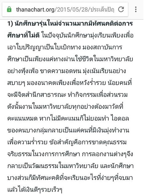 ผลิตบัณฑิตมีคุณภาพน้อย ดร.ธนชาติ นุ่มนนท์ สะท้อนปัญหาคุณภาพเด็ก ใน Blog ของท่านที่ใช้ระบบ Wordpress อ่านแล้วมีปัญหาหลายข้อที่ส่งผลต่อคุณภาพเด็ก ในความคิดของผม ผมคิดว่าปัญหามีข้อแรกข้อเดียวนี่หละที่ชัดเจน "1) นักศึกษารุ่นใหม่จำนวนมากมีทัศนคติต่อการศึกษาที่ไม่ดี" ถ้าเด็กมุ่งมั่นจริง เอาจริงเอาจังที่จะเรียนรู้ (Learning) ไป MOOC (Massive Open Online Courses) เค้ารองรับได้หมด ไป Stackoverflow (Developer Community) ก็จะพบคุณครูมากมายรอให้ความช่วยเหลือ บางคนไม่เข้าระบบการศึกษา แต่มีมุ่งมั่นก็ประสบความสำเร็จ มีมากมาย อาทิ Edward Snowden , Mark Zuckerberg , Bill Gate , Jack Ma ส่วนประเด็นอื่นที่ ดร.ธนชาติ นุ่มนนท์ ฝากไว้ว่าเป็นสาเหตุที่กระทบคุณภาพเด็ก ได้แก่ 2) กฎเกณฑ์ของ อว. 3) เน้นแต่รายได้ให้เลี้ยงตนเอง 4) เน้นจำนวนให้ตนรอดมากกว่าคุณภาพ 5) อาจารย์ขาดไฟเรียนรู้ 6) ไม่ร่วมมือกับเอกชน 7) ชนชั้นกลางฐานะดีขึ้นจึงสู้น้อยลง 8) ลงทุนวิจัยมีงบน้อย