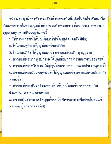 อนึ่ง ผลบุญไม่อาจชั่ง ตวง วัดได้ เพราะเป็นสิ่งเกิดในจิตใจ สั่งสมเป็น