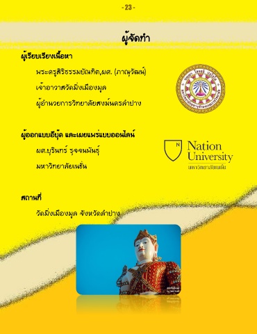 - 23 - ผู้จัดทำ ผู้เรียบเรียงเนื้อหา พระครูสิริธรรมบัณฑิต,ผศ. (ภาณุวัฒน์) ้ เจาอาวาสวัดมิ่งเมืองมูล ผู้อำนวยการวิทยาลัยสงฆ์นครลำปาง ๊ ผู้ออกแบบอีบุค และเผยแพร่แบบออนไลน์ ุ์ ผศ.บุรินทร์ รุจจนพันธ มหาวิทยาลัยเนชั่น สถานที่ วัดมิ่งเมืองมูล จังหวัดลำปาง