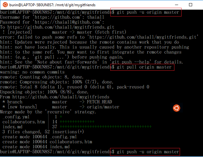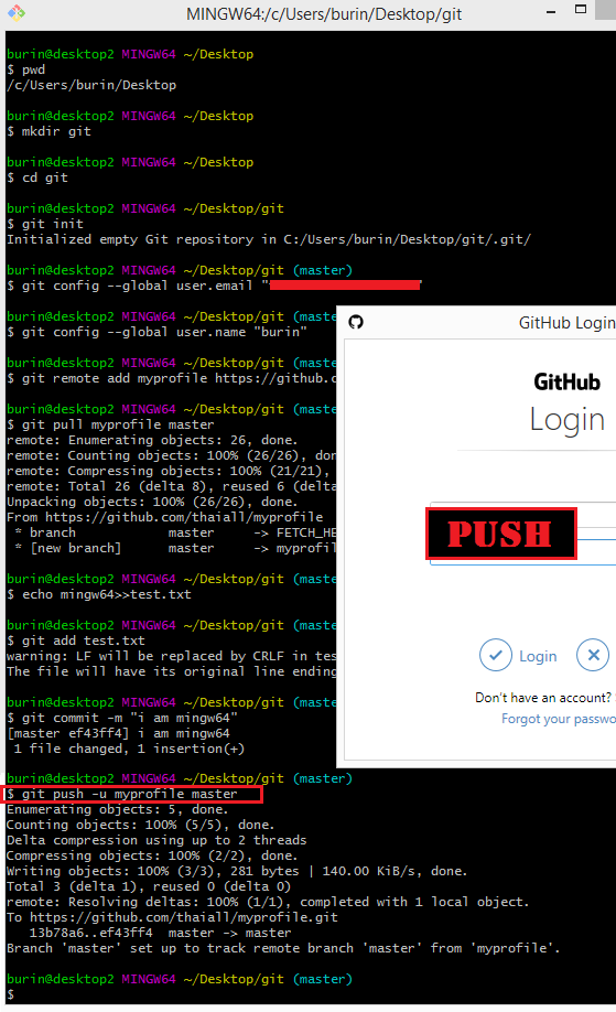 git push -u mytest master /* ถาม Login เข้า Github.com ผู้เป็นเข้าของ repo */
