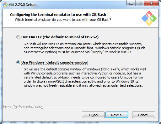 มื่อติดตั้ง Git-2.23.0-32-bit บน Windows 7 - 32 bit แล้วเลือกใช้ Terminal emulator ด้วย Git Bash ซึ่งขณะ Setup มีให้เลือก 2 แบบ คือ MinTTY Terminal กับ Windows Console ซึ่งตัวอักษรในจอภาพสองแบบนี้แตกต่างกัน ที่สำคัญ คือ ผลจากการเชื่อมต่อไปยัง FTP Server พบว่า บน Windows 7 เมื่อ Connect แล้ว ไม่มีการ Response จากเครื่องบริการ หากไม่เปลี่ยนจาก MinTTY เป็น Windows สรุป คือ ขณะติดตั้งเลือกใช้แบบ Windows ก็จะเชื่อมต่อกับ FTP Server ได้เช่นเดียวกับใช้ CMD โดยเปลี่ยนจาก Use MinTTY (the default terminal of MSYS2) ไปเป็น Use Windows' default console window