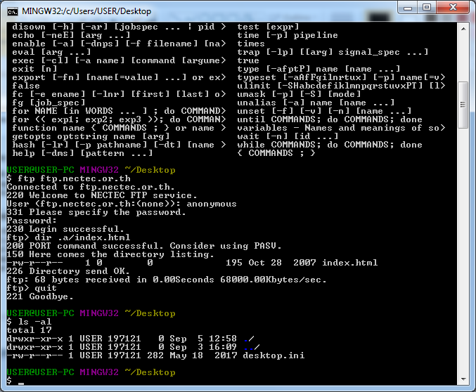 ถ้าใช้ Mingw64 บน Windows 10 แม้ใช้ MinTTY ก็ยังใช้คำสั่งใน FTP และมี Response กลับมาอย่างถูกต้อง ดังภาพตัวอย่าง แต่ทดสอบกับ ftp.nectec.or.th แล้วพบว่า server ให้บริการเฉพาะ mode passive และ windows command line ไม่สนับสนุน mode นี้