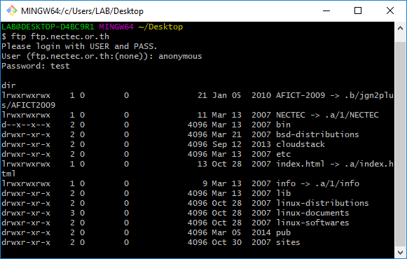 ารใช้คำสั่ง FTP เชื่อมต่อไปยัง Nectec server ด้วย anonymous สามารถคัดลอกแฟ้ม index.html ด้วย get จากเครื่อง Server มาไว้ในเครื่อง Local host ได้ แต่ในปัจจุบัน ftp.nectec.or.th ไม่สนับสนุนการใช้ ftp client ผ่าน active mode จะต้องใช้โปรแกรม ftp client ที่เปิด passive mode แต่ ftp.exe บน mingw64 หรือ windows ทุกรุ่น สนับสนุนเฉพาะ active mode จึงต้องใช้โปรแกรมที่สมบูรณ์กว่า อาทิ Filezilla , WS Ftp , WinSCP หรือ Windows explorer แทนการใช้ ftp.exe
