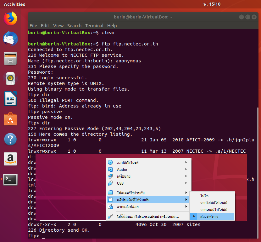 วนอ่านเรื่อง The Windows FTP command-line client (ftp.exe) does not support the passive mode, on any version of Windows. ที่ stackoverflow.com และ egnyte.com แต่การใช้ FTP บน Ubuntu (บน Virtual box) มีคำสั่ง passive ทำให้เปลี่ยน mode และเชื่อมต่อ ftp ได้ตามปกติบน linux แต่ใช้งานไม่ได้บน Windows