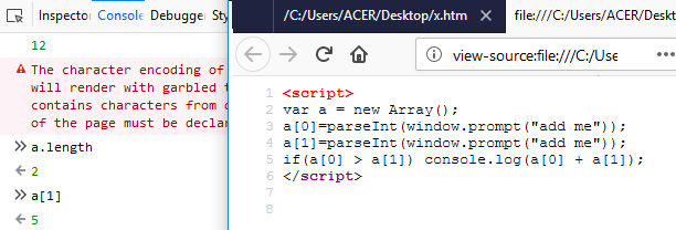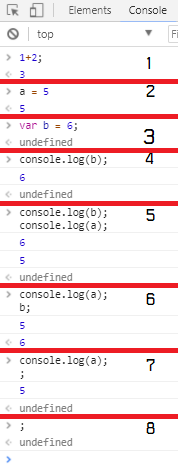 ตัวอย่างการทำงานใน console window กับการ return ค่า ตามภาพการใช้คำสั่ง พบว่า ตัวอย่างที่ 1, 2 และ 6 จะ return ค่าให้ console ได้ปกติ ตัวอย่างที่น่าสนใจ คือ คำสั่งที่ 8 แม้จะพิมพ์เพียง ; คือ เสมือนไม่สั่งอะไรเลย ใน console window ก็ยังแสดงคำว่า undefined เพราะไม่มีการคืนค่าใด ตัวอย่างที่ 2 เป็นการประกาศ และกำหนดค่า จะมีการคืนค่าออกมา จึงแสดงเลข 5 เป็นผลลัพธ์ แต่ ตัวอย่างที่ 3 เป็นการประกาศค่า ที่ไม่คืนค่าหลังประกาศ เนื่องจากใช้ var จึงแสดง undefined ตัวอย่างที่ 4 และ 5 แม้ใช้ console.log() แต่การพิมพ์คำสั่งนี้โดยตรงใน console จะไม่คืนค่าให้ console window แต่แสดงผลทันที หากใช้คำสั่งนี้ใน javascript ก็จะส่งค่าให้กับ console window เพื่อแสดงผลได้ปกติ ซึ่งเป็นคนละสถานการณ์ ตัวอย่างที่ 6 สามารถรับคำสั่งได้หลายคำสั่ง แล้วทำทีละคำสั่ง แต่คำสั่งสุดท้ายต้องเป็นการคืนค่าโดยตรง จะสลับให้ console.log() อยู่บรรทัดสุดท้าย ก็จะพบคำว่า undefined เช่นเดิม ซึ่งการรับคำสั่ง เช่น 1 + 2 + 3 นี้ ทำให้นึกถึง calculator