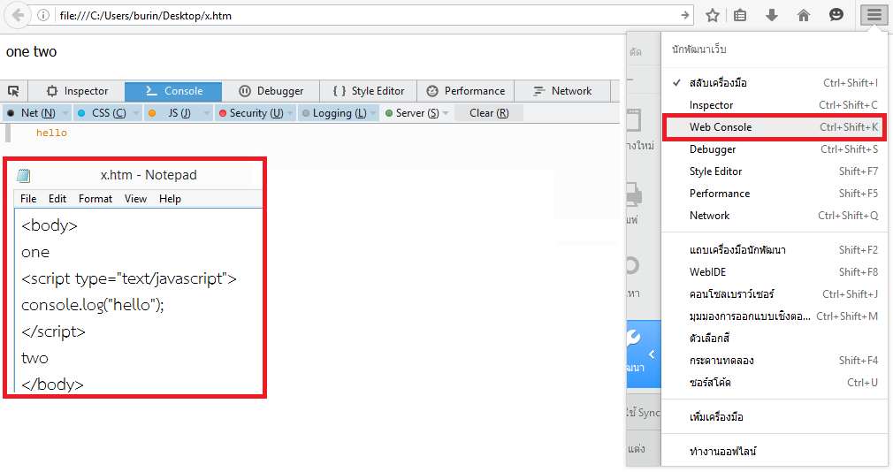ถ้าใช้ firefox จะอยู่ใน developer, web console