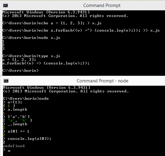 echo a.forEach((v) =^> {console.log(v);}); >> x.js