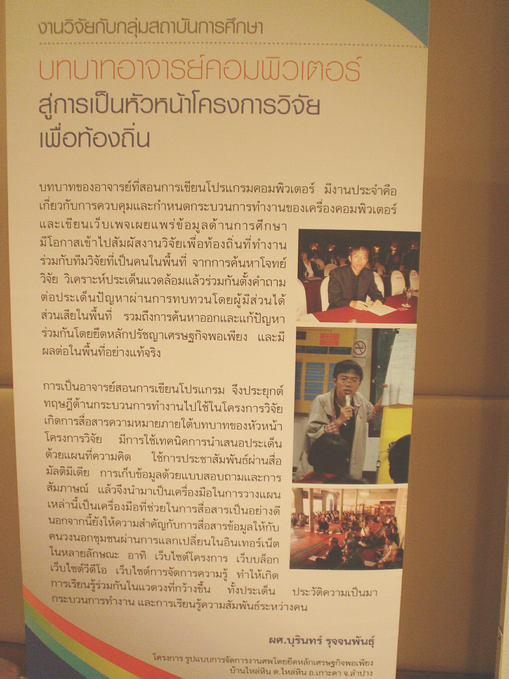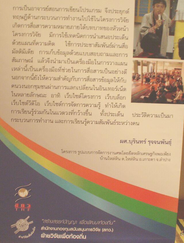 แม้หัวหน้าโครงการไม่ได้เข้าร่วม แต่ก็ได้ยินเสียงชื่นชมจาก ดร.สุชิน เพ็ชรักษ์ กศน.ภาคเหนือ ว่านักวิจัยของโครงการเล่าได้อย่างมีความสุข ทำให้เห็นภาพชัดเจนว่าโครงการประสบความสำเร็จ เพราะคนทำงานสามารถนำเสนอได้อย่างเข้าใจ และมั่นใจในสิ่งที่ได้ทำลงไปได้อย่างมีความสุข .. ผู้เขียนขอตีความอย่างที่ได้รับฟังมา