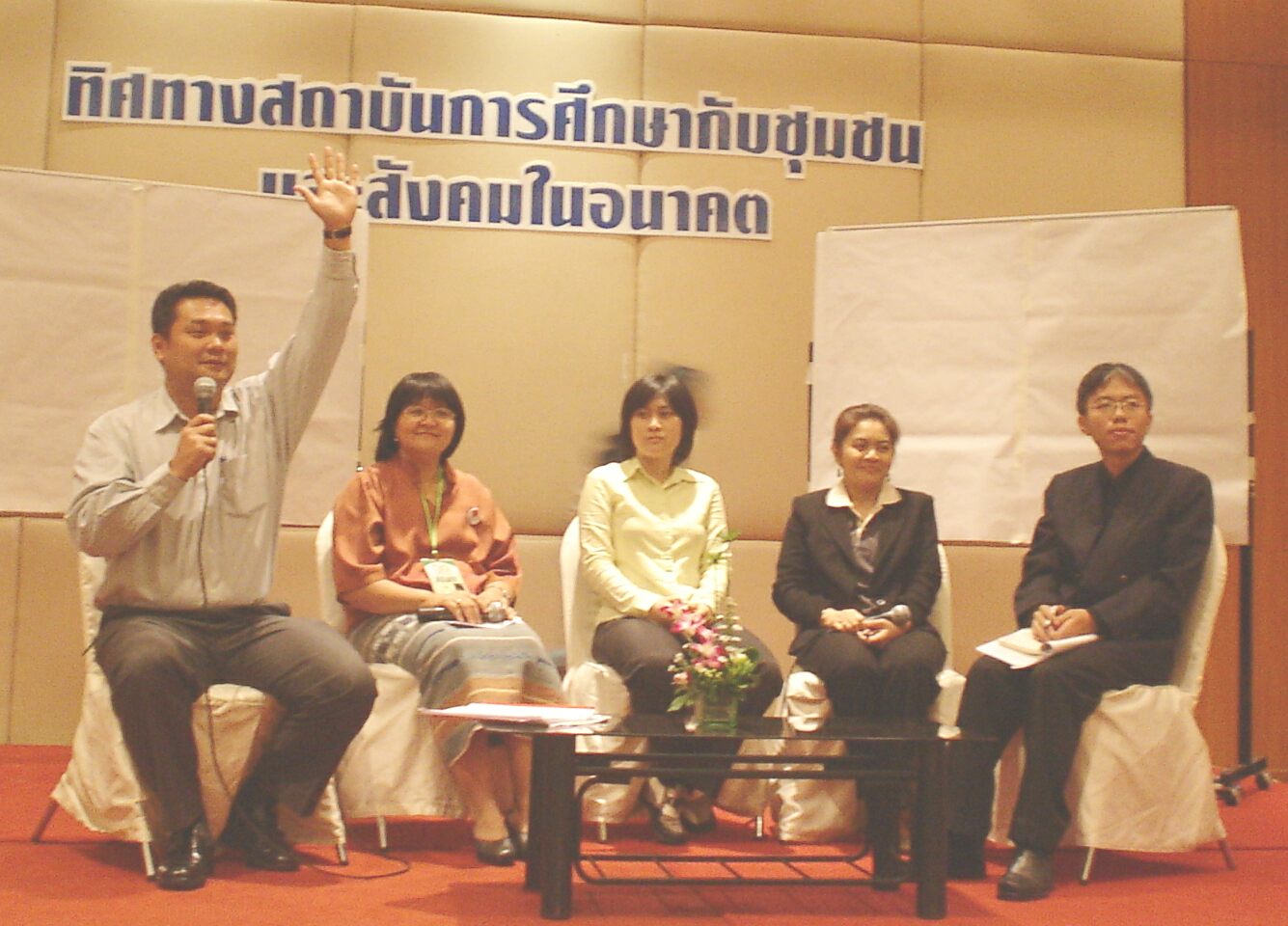บนเวทีมี คุณประพจน์ ภู่ทองคำ ดร.มยุรี ถาวรพัฒน์ อ.ไพจิตร ศรีธนานุวัฒน์ ผศ.เยี่ยมลักษณ์ อุดาการ และผศ.บุรินทร์ รุจจนพันธุ์