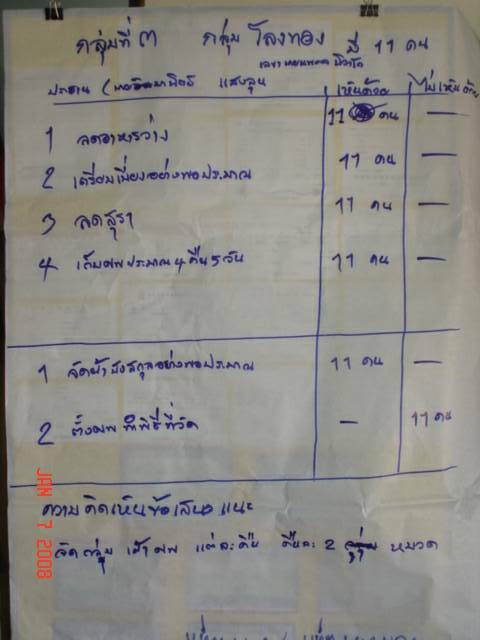 สิ่งที่แตกต่างกันในแต่ละเวทีคือ มี 3 หมู่บ้านจะใช้เสียงตามสายเชิญชาวบ้านมาประชุม คาดว่ามากกว่าในแผนคือ 40 คนหลายเท่าตัว ยกเว้นบ้านมะกอก-นาบัวใช้หนังสือเชิญรายบุคคลจำนวน 50 แผ่น