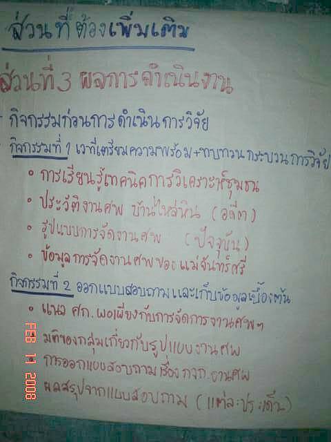 โดยกิจกรรมต่อไปคือ ประชุมสรุปผลลงแต่ละหมู่บ้าน นำผลการประชามติเสนอให้สภาวัฒนธรรมประกาศของตำบลรับรอง เสนอให้สภาฯอำเภอรับรอง มอบเครื่องมือ 3 ชิ้นให้แต่ละหมู่บ้านใช้เป็นเครื่องมือ คือ 1)Future Board ติดที่วัด 2)ประกาศสภาวัฒนธรรมใช้เป็นคู่มือ 3)ป้ายไวนิวติดในงานศพ