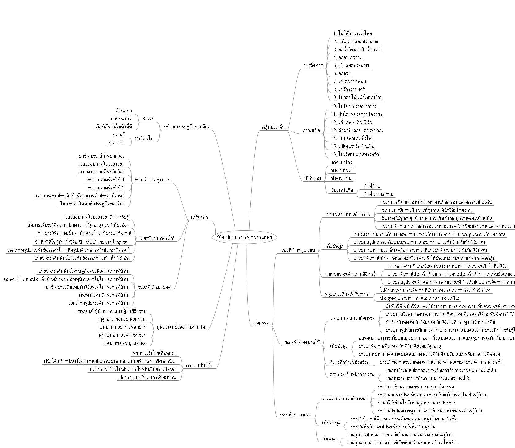 วางแผนเก็บข้อมูลในงานศพจาก ผู้ร่วม เจ้าภาพ แม่บ้าน และสารวัตร เริ่มเก็บข้อมูลเหตุการณ์ที่เกี่ยวข้องว่าเกิดปีใด โดยใคร อย่างไร