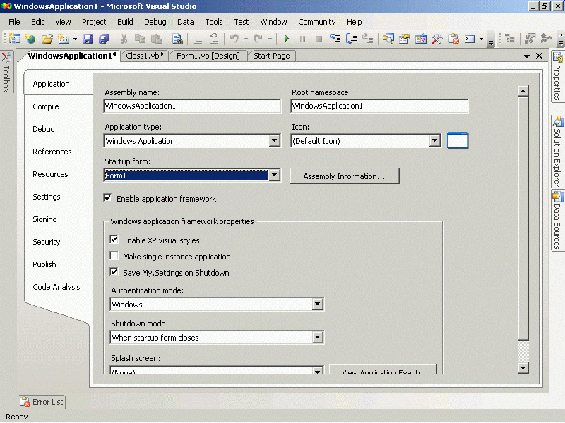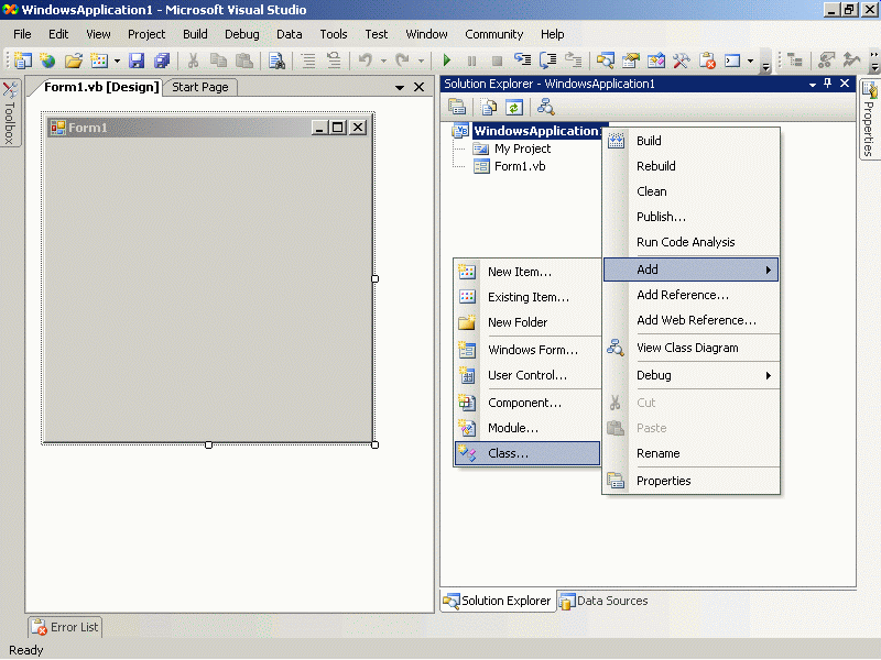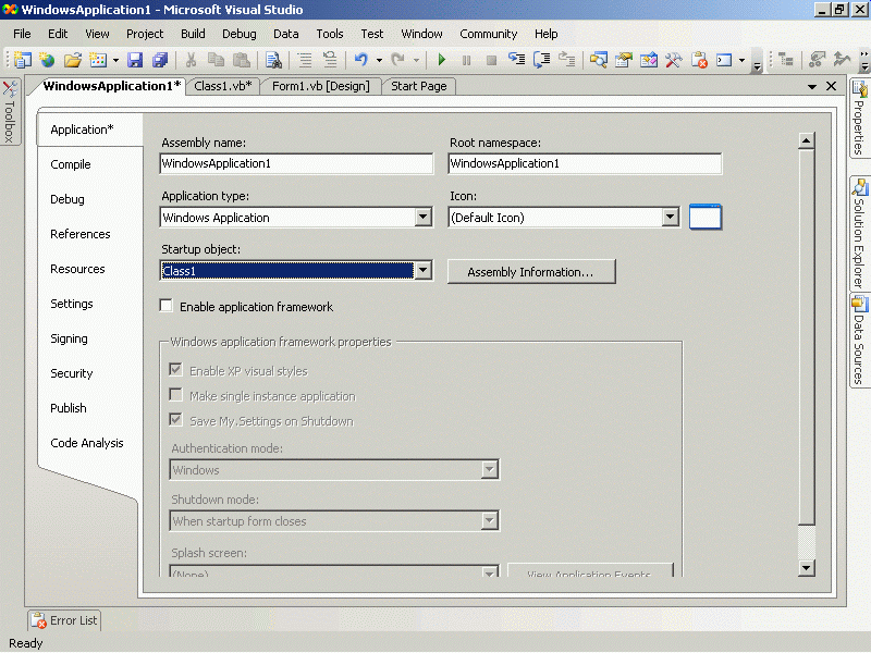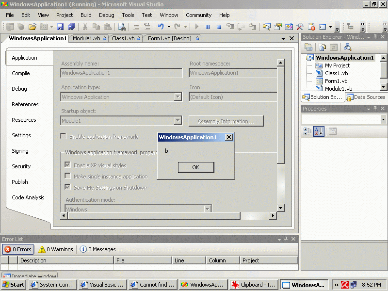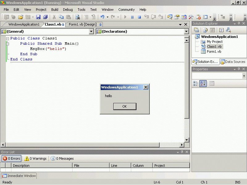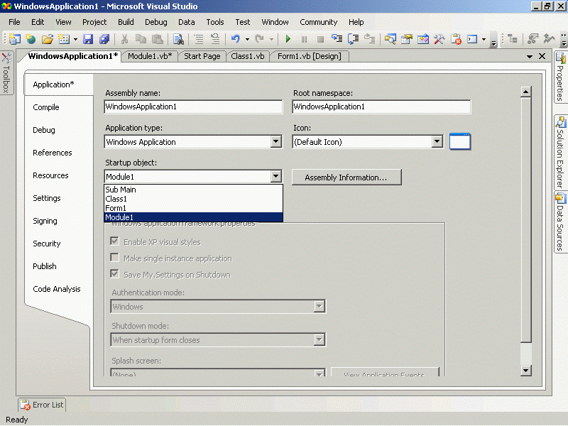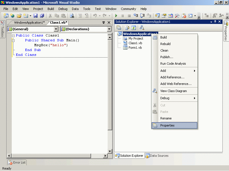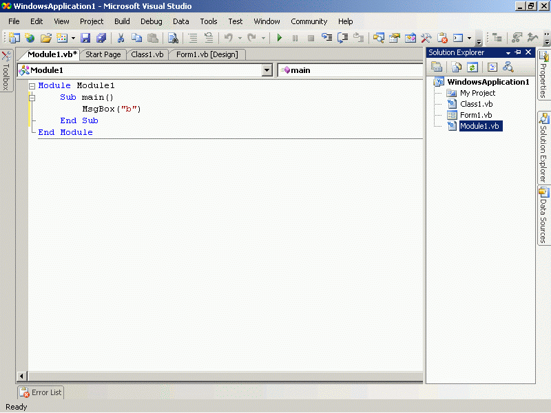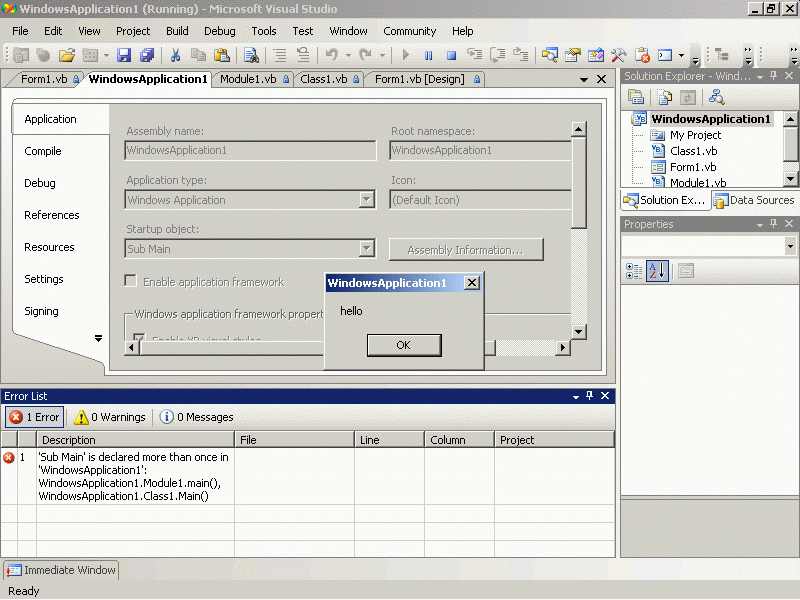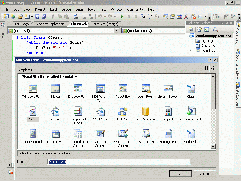 Public Class Class1 Public Shared Sub Main() MsgBox ("hello") End Sub End Class Module Module1 Sub main() MsgBox("b") End Sub End Module